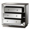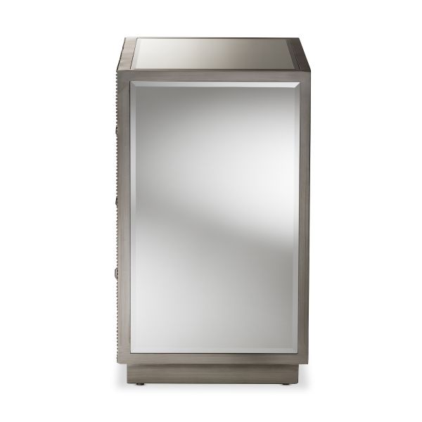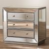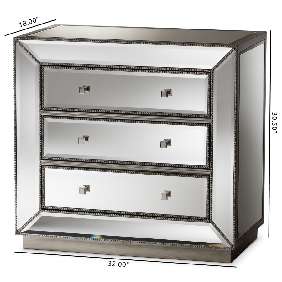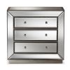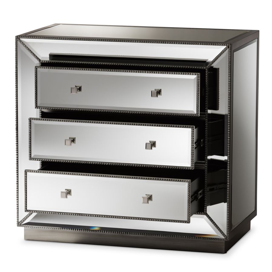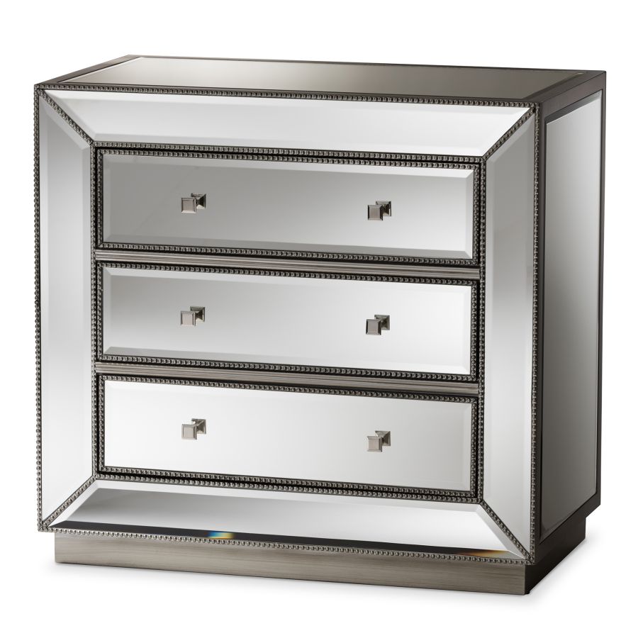Combining gold-tone beaded trim, beveled mirrors and crystal clear faceted pulls, the Edeline 3-drawer chest is sophisticated and stylish while its mirrored finish will add sparkle and shine as it reflects light everywhere. The Champagne finish creates a frame for the mirrors as does the gold-tone beaded trim whereas the crystal clear drawer pulls complete this glamorous look for the bedroom or living area. Constructed of MDF and encased with mirrors, the Edeline will be a statement piece in your bedroom. Functional with three large drawers, the Edeline provides ample storage space for your linen, lingerie and clothes. Mirrored chest comes fully assembled, with only the drawer handles to attach. Made in China.