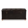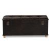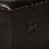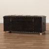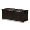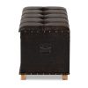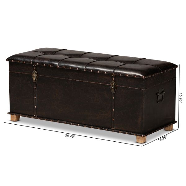 Organize your space with the robust and practical design of the Janna storage ottoman. Made in China, this ottoman is comprised of a sturdy wood frame upholstered in distressed dark brown faux leather. Its button tufted cushion is padded with plush foam to act as a convenient footstool or as extra seating when needed. Fully assembled, the top of the Janna opens to reveal spacious storage for extra blankets, pillows, and more. Brass finished metal handles and latches add a vintage touch, while antique copper finished metal nailheads accentuate the dark brown faux leather. Oak finished feet complete the look, making the Janna ottoman a distinguished solution to your storage needs.