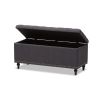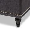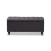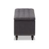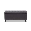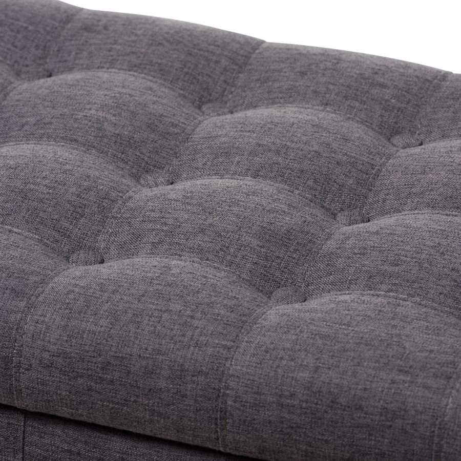 Whether paired with upholstered bed as a bed end bench or simply on its own, this modern classic button-upholstered storage ottoman offers classic and smart interiors styling with practical internal storage that will work in any room. Add an on-trend neutral accent to a simple white room, the Kaylee storage ottoman bench is upholstered in polyester fabric available in your choice of beige, greyish beige, dark grey or light blue color for a neutral or statement look. Constructed of solid rubberwood frame and feet, the Kaylee is built to last. The ottoman box opens up to reveal internal storage for blankets and bed linen. Softly padded, the top of the lid features button-tufting with grid lines while the sides are trim with silver nail heads for a modern look. For refined elegance, the detailed stitching on all sides and the classic feet complete the look. Made in Malaysia, the Kaylee storage ottoman bench requires minor legs assembly