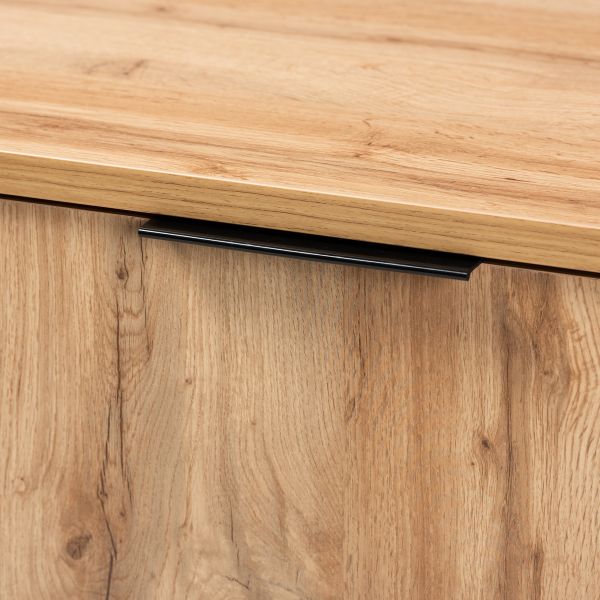 With its clean lines and natural wood tones, the Reid buffet is a stylish addition to any space. This wood buffet pairs a natural oak finish with black metal for a cool, contemporary look. Three drawers provide space to store silverware and linens, while four concealed shelves, behind two doors, provide storage for plates and glassware. Long black metal handles add a chic, minimalist touch. The Reid buffet is made in Malaysia and requires assembly.